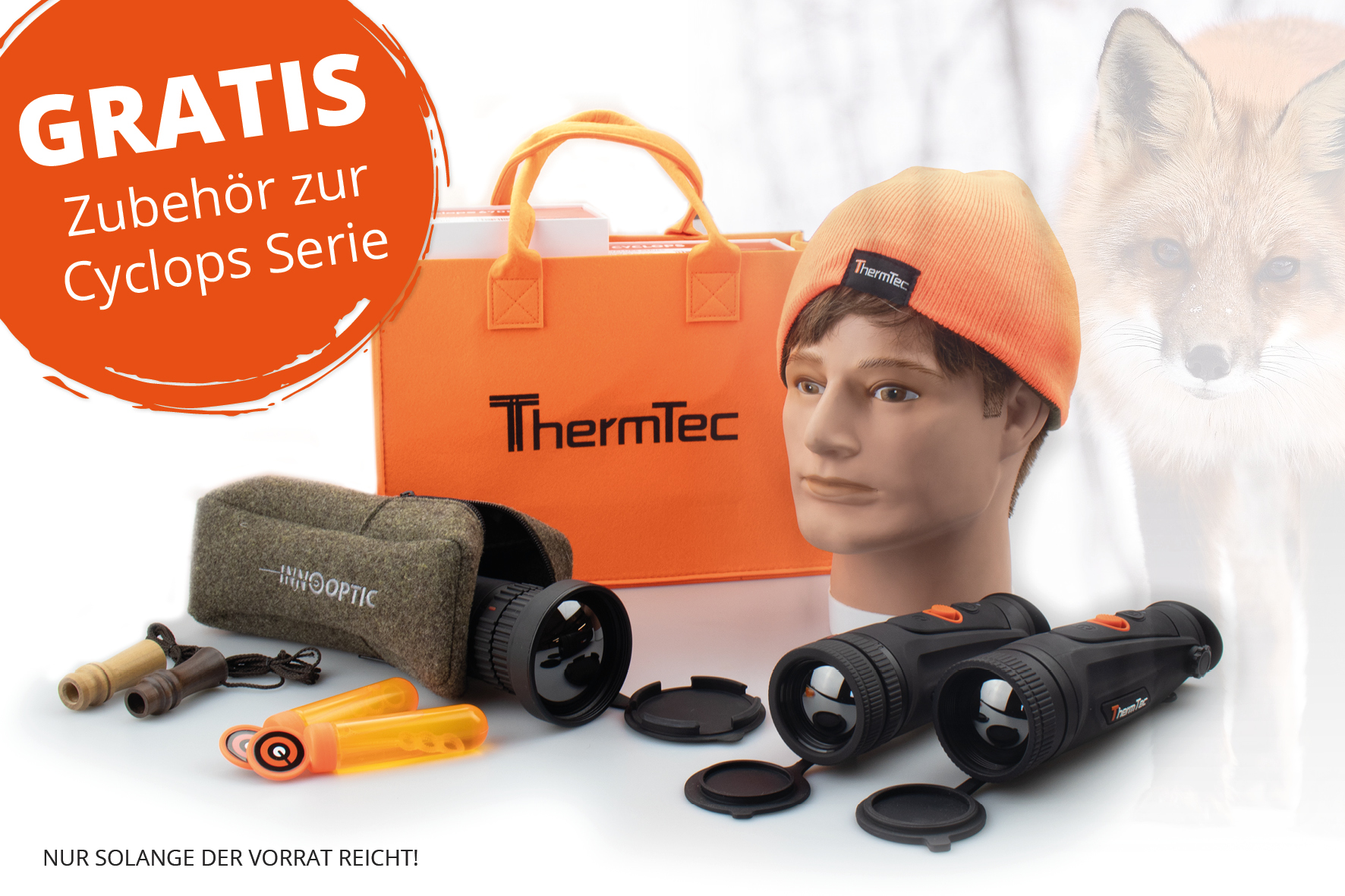 Gratis Zubehör: 1x Fuchslocker, 1x Windprüfer, 1x Innooptic Schutztasche, 1x Shopping Bag, 1x Wendemütze